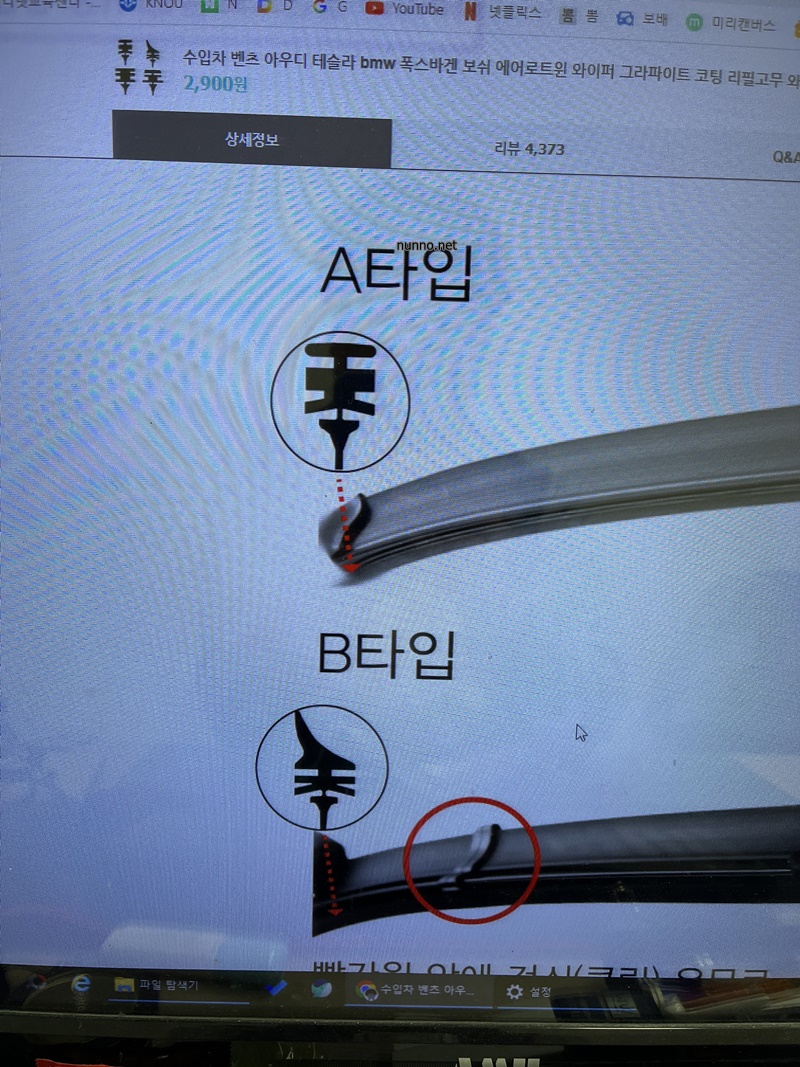그렇게 한쪽 창고에 잘못 산 와이퍼를 쟁겨두고 또 며칠 을 지나다 이제는 교체 해야 겠다 싶어 인터넷 검색좀 하다 와이퍼 날을 교체하면 정말 괜찬을 까 하는 생각에 , 얼른 기존 와이퍼 날 모양 확인 하고 바로 구매를 눌러버렸습니다.
