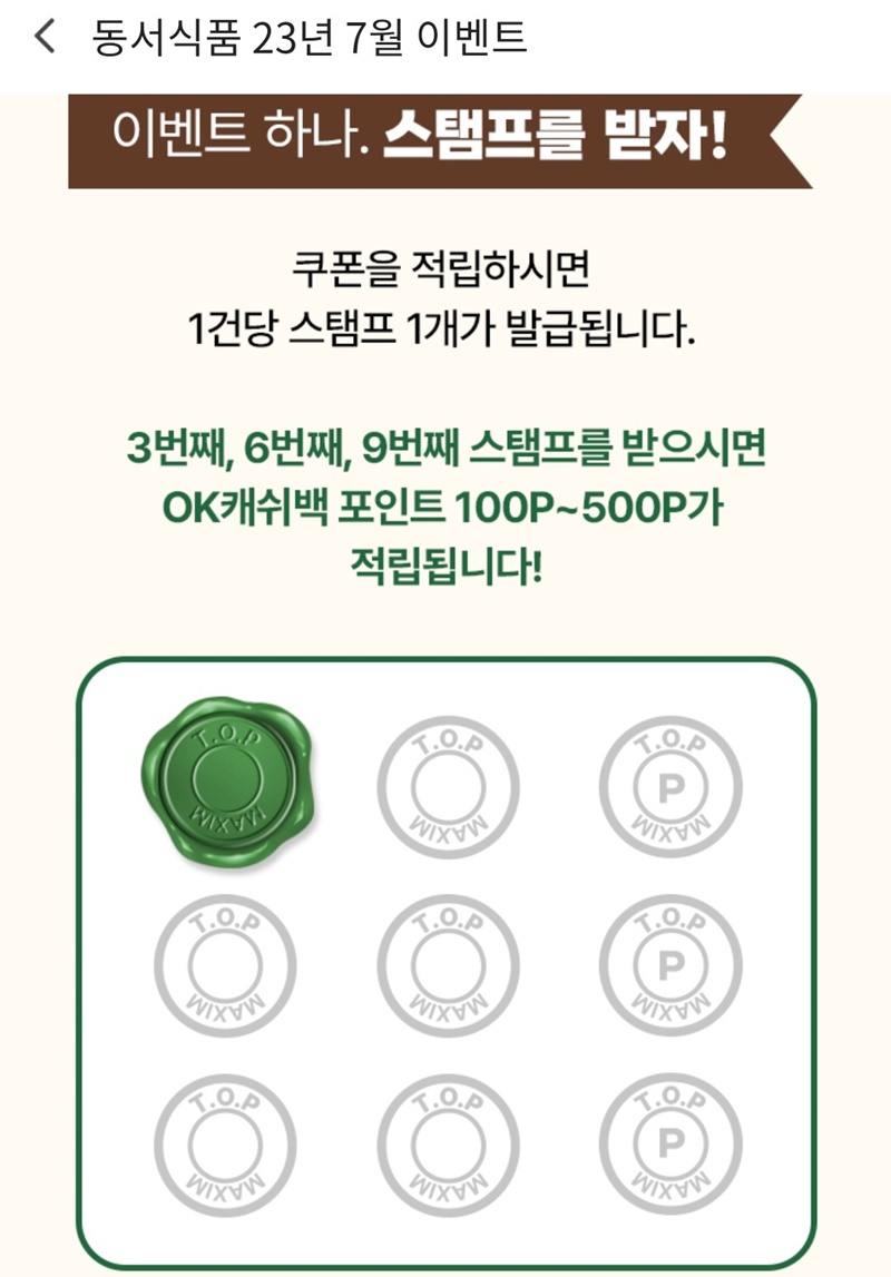 등록시 스탬프 1개씩 적립 3,6,9번 째 등록시 OK캐쉬백 100~500포인트 적립 1회 참여됨