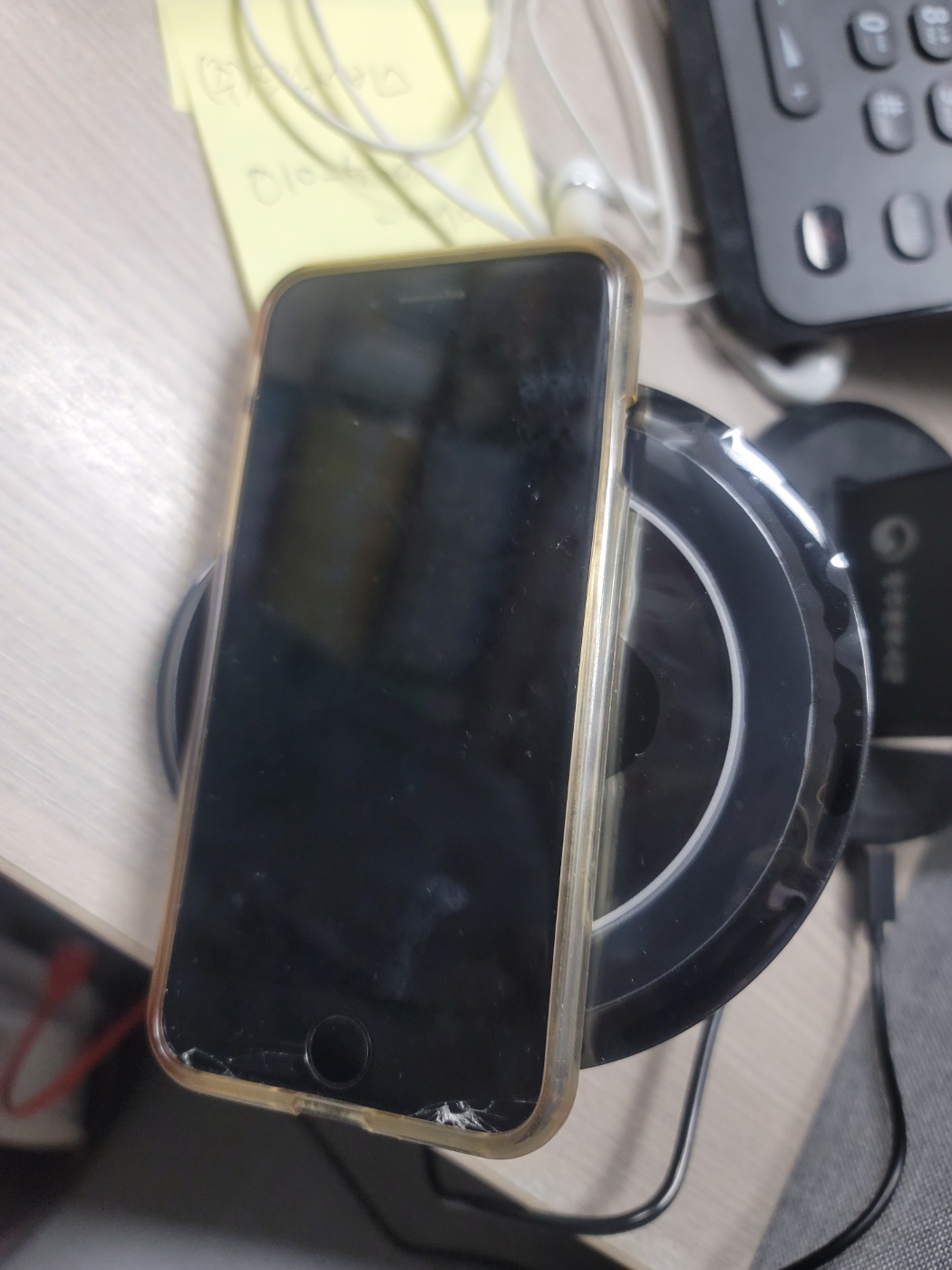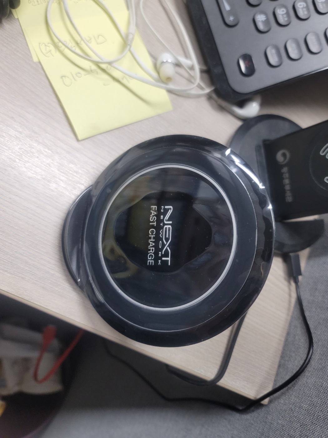 <사진설명 : 덤으로 받은 탁상용 휴대폰 거치 충전기 휴대폰은 아7으로 무선충전은 안되지만 사진용예시로 올려 둠, 직원들 나눠줌>