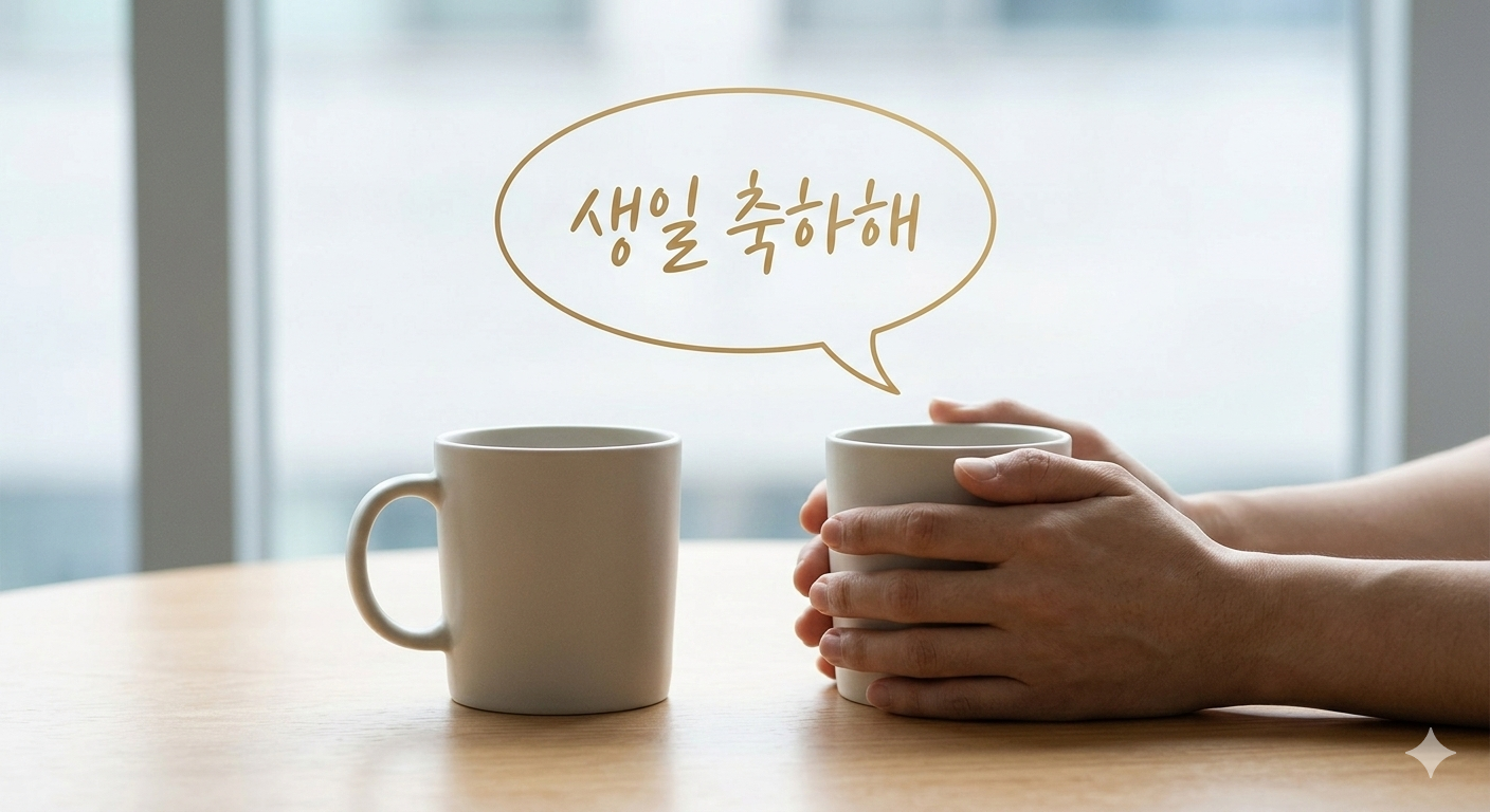 그림2. AI생성이미지- A serene, minimalist photograph. Two coffee mugs are sitting on a wooden table. A pair of hands is wrapped around one of the mugs, and a stylized speech bubble, rendered in a warm, glowing script, floats above the mugs with the text "생일 축하해" (Happy Birthday) written in Korean. The setting is clean and tranquil, focusing on the intimate human connection and the weight of the sincere words.