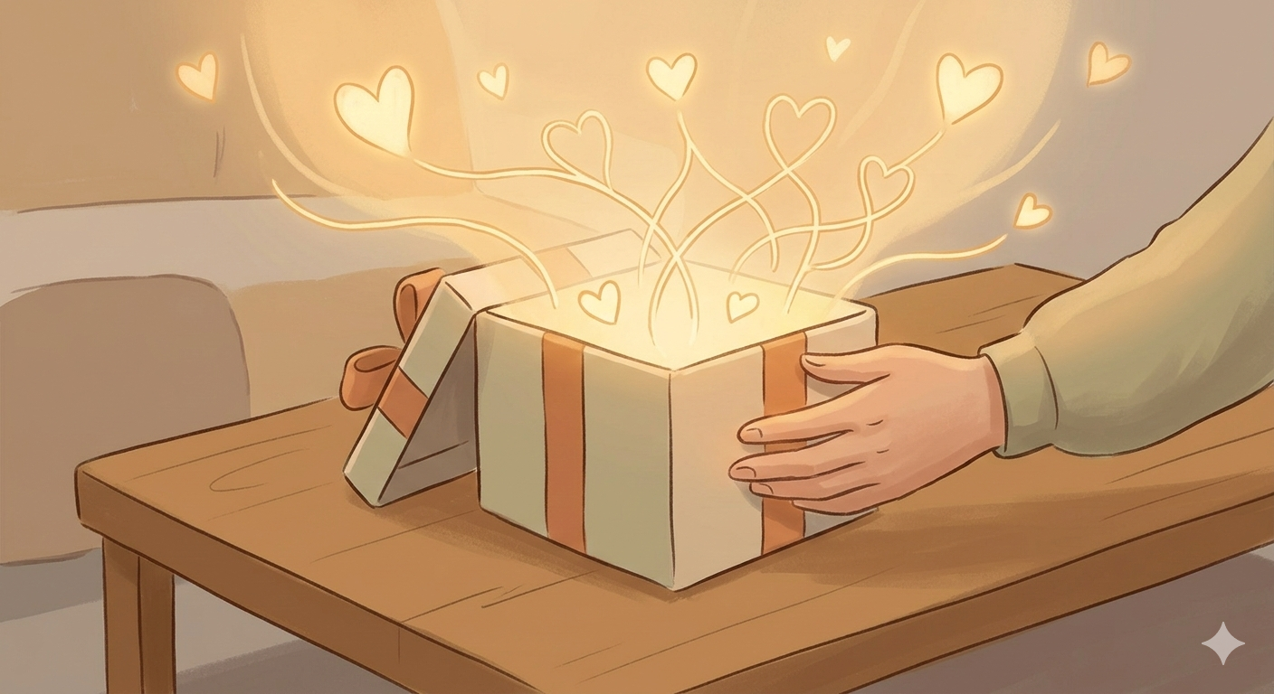 그림2. AI생성이미지- A cozy, slightly whimsical illustration. An open gift box is placed on a table. Instead of physical items, a gentle, warm, golden light flows out of the box, taking the shape of stylized, floating hearts and connected threads (symbolizing relationships). The hand is gently touching the box. The background is a simplified, comforting domestic setting. The art style is soft digital painting.