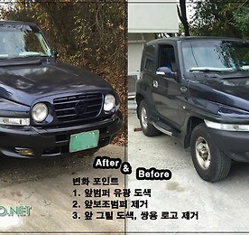 뉴코란도 시그널램프 교체 및 일부판도색,몰딩 유광도색 DIY nunno.net 의 뉴코란도 수리일기 총 7편 입니다.도색 위주로 작성 하였으나 마무리를 못해 아쉽지만, 마무리 하며 종합 정리합니다.각각 클릭하시면 해당 페이지로 이동 합니다. 1. 뉴코란도 사이드스탭 파손 복구 퍼티작업 DIY [http://nunno.net/200]2. 뉴코란도 몰딩백화 도색 DIY [http://nunno.net/208]3. 뉴코란도 본넷 도색 DIY 망함 [http://nunno.net/207]4. 뉴코란도 도색 DIY 본넷 도색편 [http://nunno.net/210]5. 뉴코란도 시그널램프 교체 및 일부판도색,몰딩 유광도색 DIY [http://nunno.net/214] 더보기